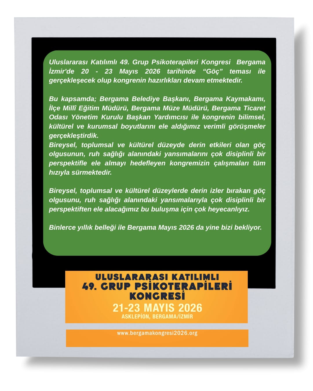20 -23 Mayıs 2026’da Uluslararası Katılımlı 49. Grup Psikoterapileri Kongresi’nde yine yeniden Bergama’da buluşmak üzere.